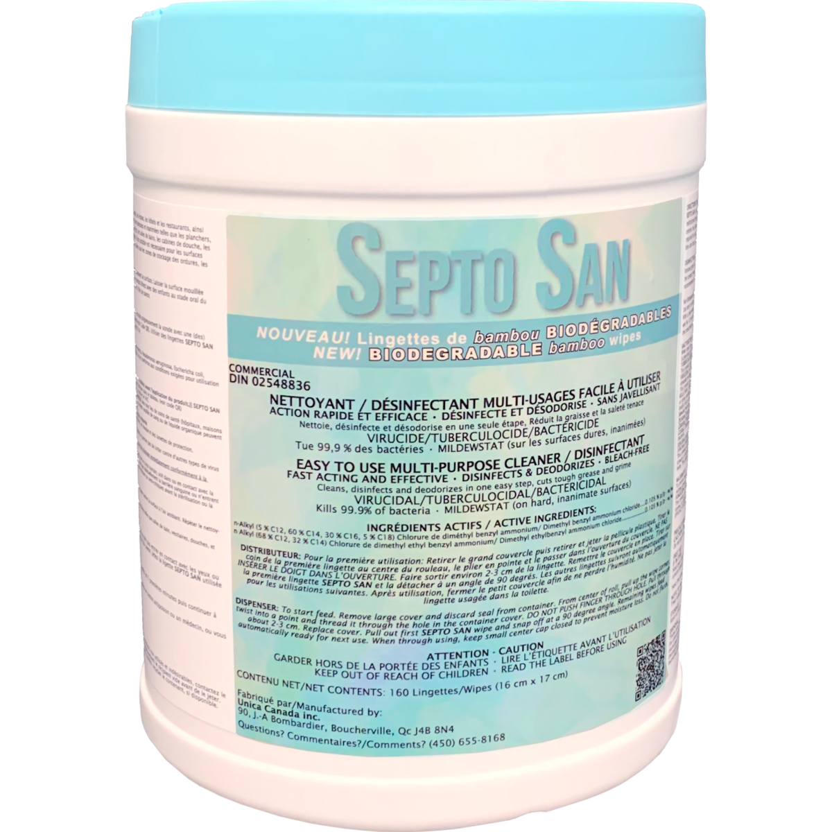 SEPTO SAN lingettes nettoyantes et désinfectantes en une étape faite de bambou.