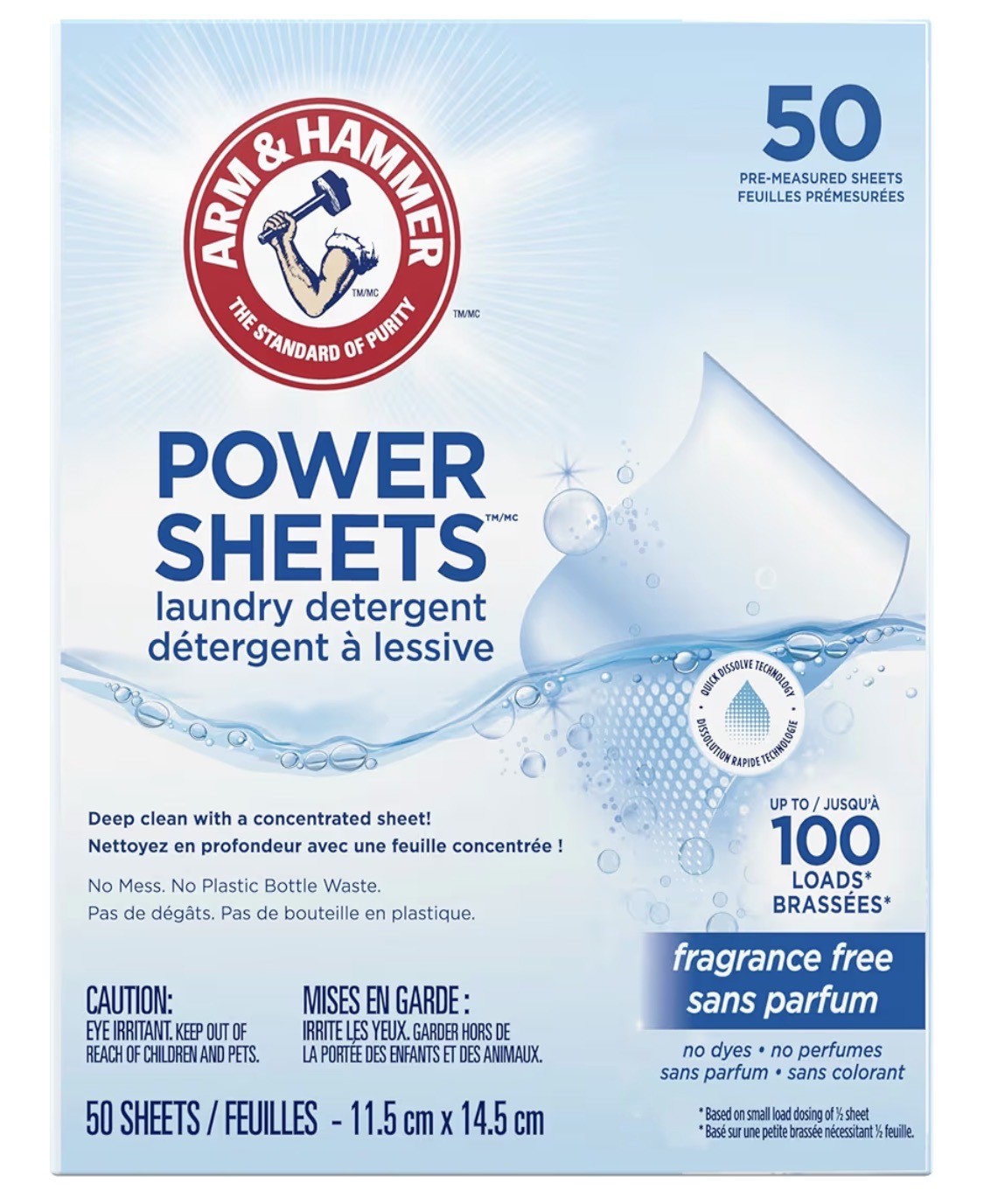 - Une boîte de 50 feuilles de détergent à lessive Power Sheets ARM & HAMMER au parfum de Lin frais nettoie 50 brassées moyennes (jusqu’à 100 petites brassées) lorsqu’utilisée selon le mode d’emploi; ce détergent à lessive concentré offre un nettoyage en profondeur puissant sur les vêtements foncés ou blancs sans javellisant